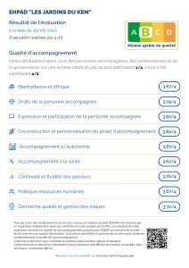 Au regard des résultats de sa visite d’évaluation externe, l’UVP « Les Jardins du Kem » présente un accompagnement globalement très satisfaisant, respectueux des droits et centré sur la bientraitance, avec une cotation moyenne élevée sur les trois chapitres évalués. Les points forts concernent la qualité de vie, la participation sociale, la prévention des risques, la gestion du circuit médicamenteux et l’implication des familles. L’établissement dispose d’un environnement sécurisé et favorise des approches non médicamenteuses innovantes, en lien avec des partenariats culturels et associatifs. La politique qualité et gestion des risques est structurée et régulièrement réévaluée, avec des outils adaptés et des procédures claires.